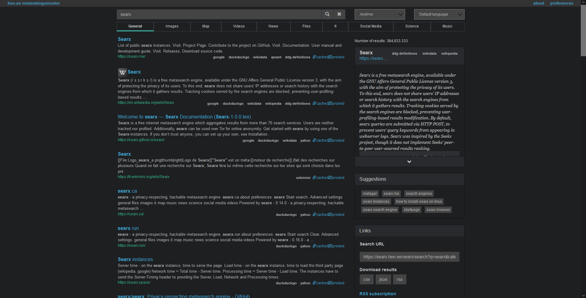 It can also act as a proxy for these search engines as your server is doing the requests to Google not your machine which is more private while still having Google’s results. One downside can be the speed due to it having to pull information from another server; some engines might be slower than others and that is shown on Searx’s settings.